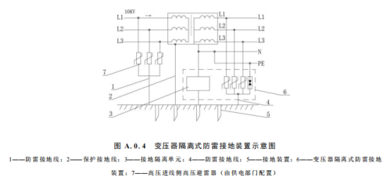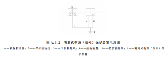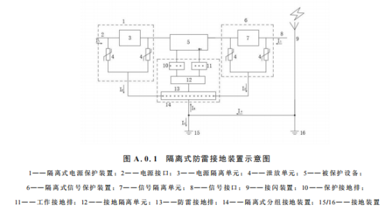 隔離式防雷接地裝置可包含隔離式電源保護裝置、隔離式信號保護裝置、隔離式分組接地裝置。隔離式電源保護裝置應串接在電源端口;隔離式信號保護裝置應串接在信號端口;隔離式分組接地裝置應串接在接地干線和接地體之間。